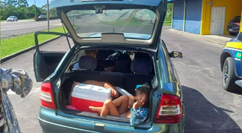 Duas crianças, de 08 e 11 anos, estavam sendo transportadas dentro do porta-malas de um veículo, disputando espaço com as sacolas e uma caixa térmica. O carro foi flagrado pela Polícia Rodoviária Federal (PRF) no último domingo (5), em Paulo Lopes, na Grande Florianópolis.