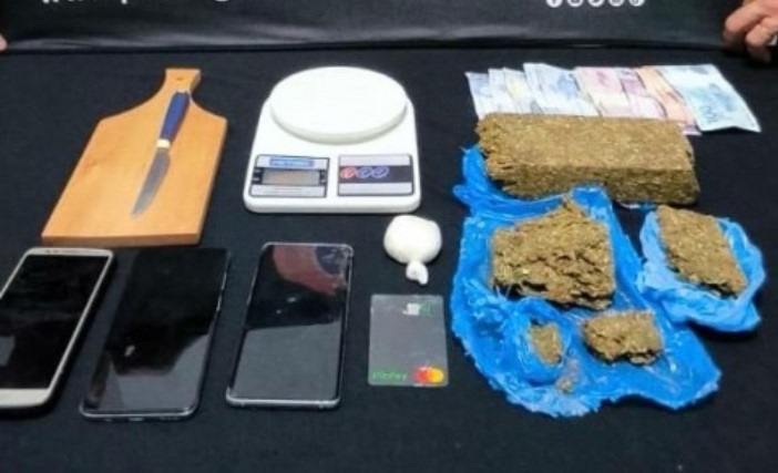 Durante as buscas no local, foram encontrados aproximadamente 700 gramas de maconha, 30 gramas de cocaína, uma balança de precisão, dinheiro em espécie, três telefones celulares e outros objetos utilizados no tráfico.