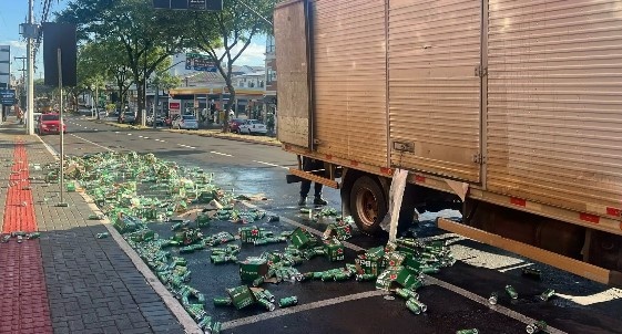 Um caminhão carregado de cerveja perdeu parte da carga na manhã desta quinta-feira (27) na Avenida Fernando Machado, em Chapecó, após o compartimento do veículo se abrir, derrubando um pallet de latas sobre a via. O incidente ocorreu em frente a um restaurante no cruzamento com a Rua São João, no centro da cidade.