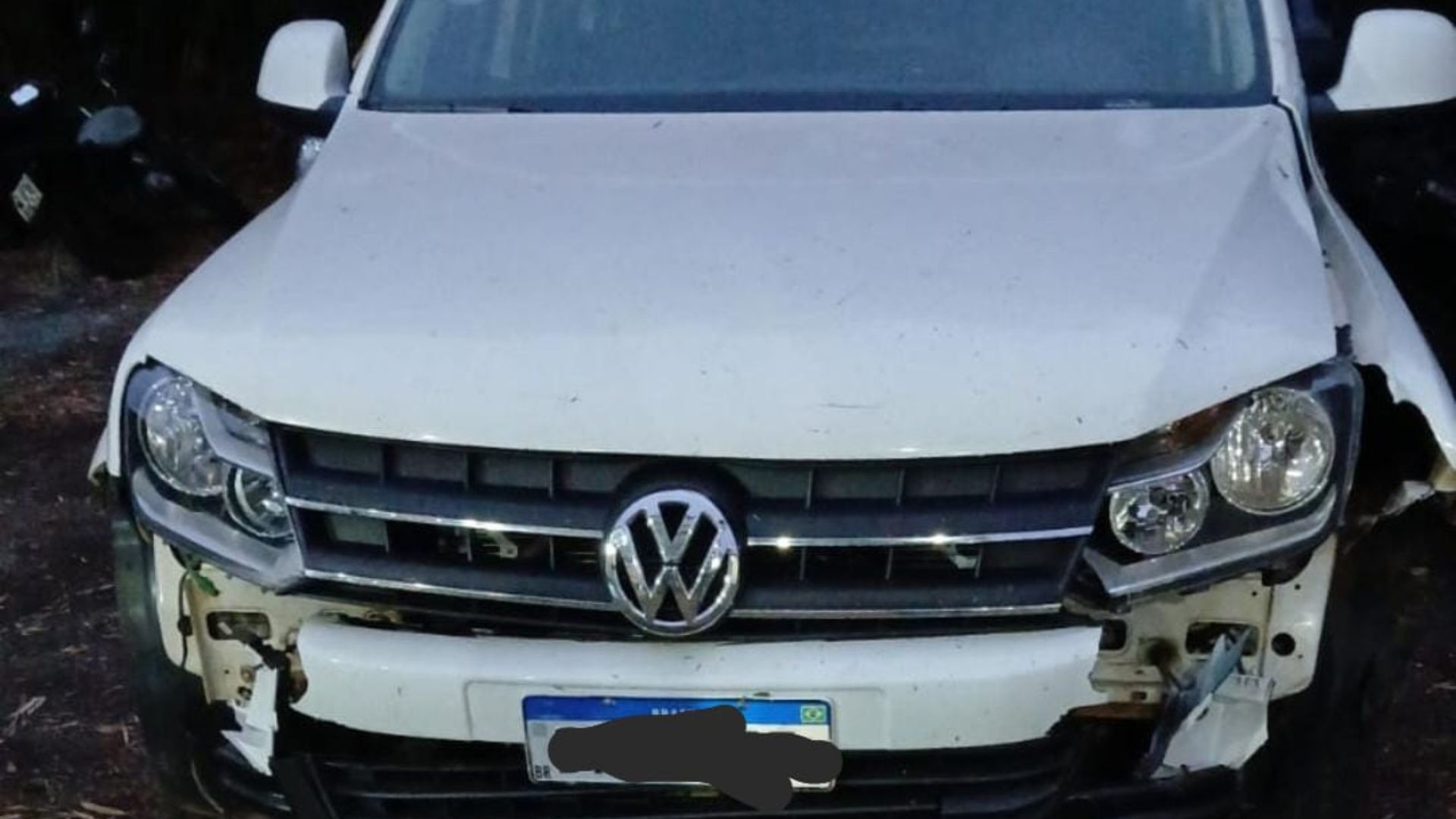 Quando os policiais chegaram no local encontraram a camionete VW Amarok, placas de Palma Sola em frente o portão que havia sido derrubado pelo veiculo e o condutor apresentando sinais de embriaguez.