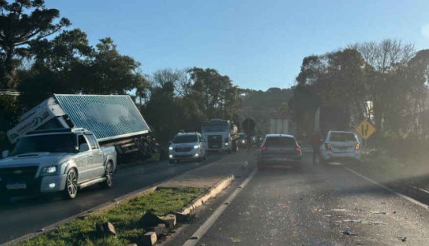 Um engavetamento envolvendo cinco veículos foi registrado na manhã desta quarta-feira (17), por volta das 7h30, no km 517 da BR-282, em Xaxim. A colisão traseira envolveu três automóveis, um caminhão e um quinto veículo que se evadiu do local.