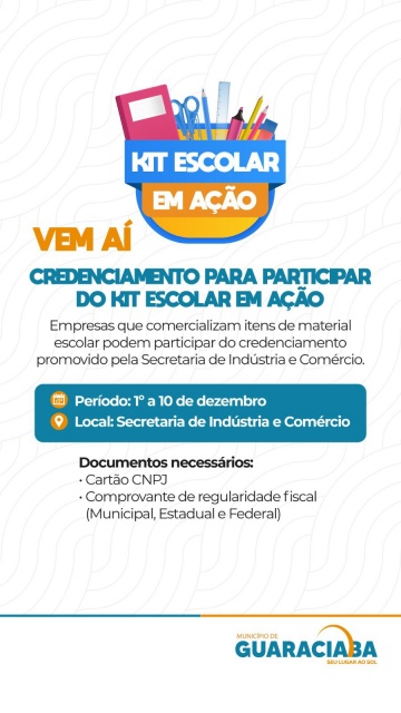 A Administração Municipal de Guaraciaba, por meio da Secretaria de Educação, implantou o Programa Kit Escolar em Ação. Conforme a secretária de Indústria e Comércio, Cinthia Borsatto, na segunda-feira (01) iniciou o credenciamento para as empresas interessadas em vender o material escolar dentro do Programa. Podem se credenciar empresas com sede no Município de Guaraciaba, que deverão entregar cópia do Cartão CNPJ e comprovante de regularidade fiscal (Municipal, Estadual e Federal). O prazo para credenciamento encerra no dia 10 de dezembro.