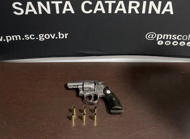 Durante as diligências, os policiais foram até a residência do suspeito, onde encontraram um revólver calibre .32 com seis munições deflagradas.