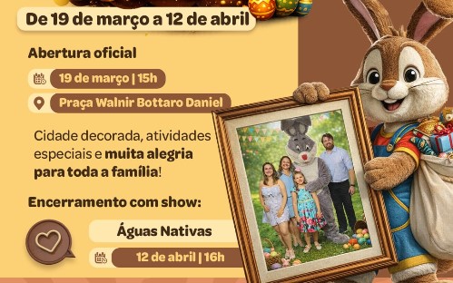 A abertura oficial acontece no dia 19 de março, às 15h, na Praça Walnir Bottaro Daniel, marcando o início das comemorações. Durante o período, a praça, calçadão, a secretaria de cultura e bosque do centro administrativo, receberão uma decoração temática de Páscoa, criando um ambiente ainda mais bonito para moradores e visitantes.
